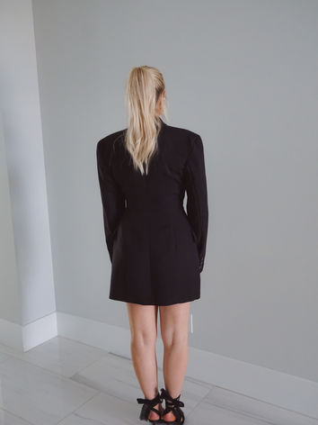 This outfit is a structured black blazer dress that exudes powerful sophistication and high-fashion edge. It features sharp, exaggerated shoulders that give a commanding silhouette, along with a tailored fit that cinches at the waist to emphasize the figure. The front is detailed with three buttons and two flap pockets, adding a classic menswear-inspired touch to the modern, feminine cut. The length is short, hitting above the knee, making it perfect for pairing with statement heels like the strappy bow-adorned ones shown here. The back is clean and streamlined, maintaining the crisp, tailored aesthetic throughout. This blazer dress is a bold choice for cocktail parties, fashion events, or a night out—wherever you want to stand out with sleek, confident style.