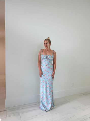 This dress is a charming and feminine piece perfect for spring and summer occasions. It features a soft baby blue base adorned with a delicate all-over floral print in shades of pink and green, giving it a romantic, vintage-inspired feel. The silhouette is sleek and figure-flattering, with a gently flared hem that adds graceful movement. The back of the dress showcases thin spaghetti straps that tie into dainty bows at the shoulders, adding a sweet, customizable touch. A subtle back zipper ensures a smooth fit, while the open upper back brings in a hint of allure. Ideal for garden parties, bridal showers, or daytime weddings, this dress blends classic beauty with a light, effortless charm.